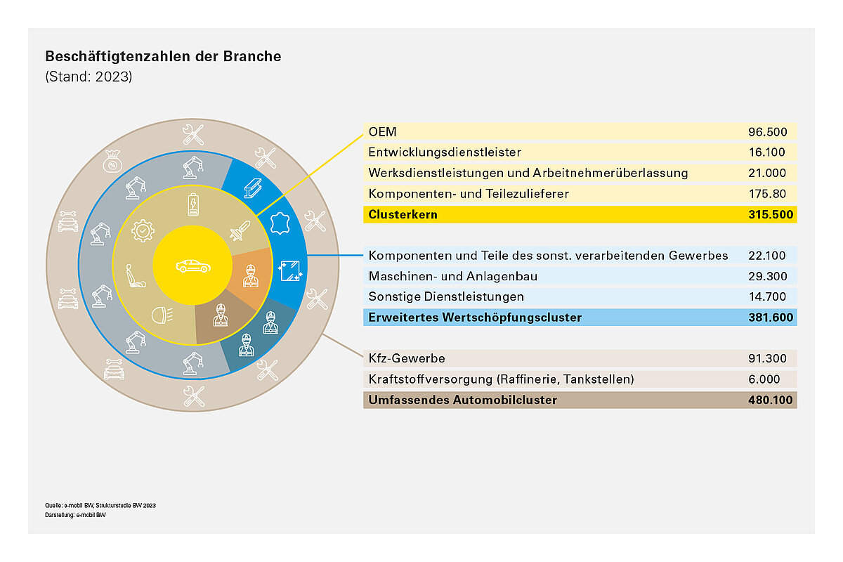 In Baden-Württemberg sind rund 480.000 Menschen in der Automobilwirtschaft beschäftigt. Damit hängt jeder zehnte Arbeitsplatz vom Automobil ab. Zum Automobilcluster zählt nicht nur der Fahrzeugbau selbst, sondern u.a. auch Beschäftigte anderer Branchen wie dem Maschinenbau oder dem Kfz-Handel wie die folgende Grafiken zu Beschäftigungstruktur zeigten. Wie sich Umsatz und Ausgaben für Forschung und Entwicklung (FuE) der Branche entwickelt haben, ist in den Tabellen zu sehen. Im bundesweiten Vergleich der Ausgaben für Forschung- und Entwicklung belegt Baden-Württemberg einem Spitzenplatz. Insbesondere der Kraftfahrzeugbau verfügt über eine hohe Innovationsdynamik.